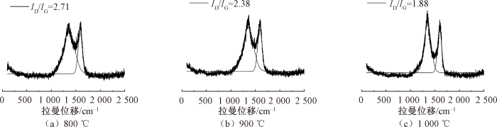 进一步分析D峰半高宽(FWHM)的变化发现,其数值随温度升高呈现递减趋势,例如800 ℃时FWHM较宽,而1 000 ℃时明显收窄。这个现象归因于高温下含氧/硫官能团的脱除、碳-杂原子交联键的断裂以及涡轮层结构的形成,多环芳烃堆叠的无序度因此降低。相比之下,G峰的半高宽未呈现显著规律性变化,这与G峰同时来源于石墨微晶和局部有序碳链的双重贡献有关[28]。