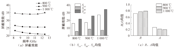 Electromagnetic shielding performances of samples at different charring temperatures. (a) Se values; (b) SeA, SeR and SeT values; (c) R and A values