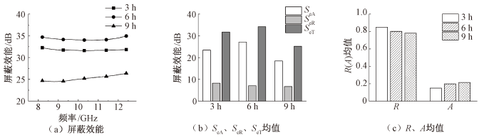 从图9(c)可知,磺化时间显著影响碳纤维织物的电磁屏蔽机制。当磺化时间为3 h时,碳纤维织物的电导率为237.3 S/m,R系数为0.85,A系数为0.15,材料电导率较高,反射损耗强,但内部交联不足,炭化后纤维呈空心结构,内部碳纤维对电磁波耗损能力减弱,因此其屏蔽效能低于6 h磺化的样品。延长磺化时间至6 h后,R系数降至0.80,A系数增至0.20,此时材料电导率也达到最高(321.8 S/m),这是由于PE的磺化交联程度提高,炭化后编织结构和碳纤维结构都得到最大程度的保留,形成连续的导电路径,屏蔽效能有所提升。磺化时间延长9 h后,电导率降至165.0 S/m,同时R系数降至0.78,这个现象归因于过度磺化导致的织物结构损伤(如图2所示),纤维间连接点断裂和编织结构破坏,降低了导电网络的连续性。从不同磺化时间处理的实验数据能够看出,磺化6 h为最佳条件,其平衡了碳纤维导电能力和导电路径完整性,展现了最优的屏蔽效能;不同磺化时间处理的碳纤维织物均展现出较高的导电性能,因此织物对电磁波的屏蔽机制以反射为主。
