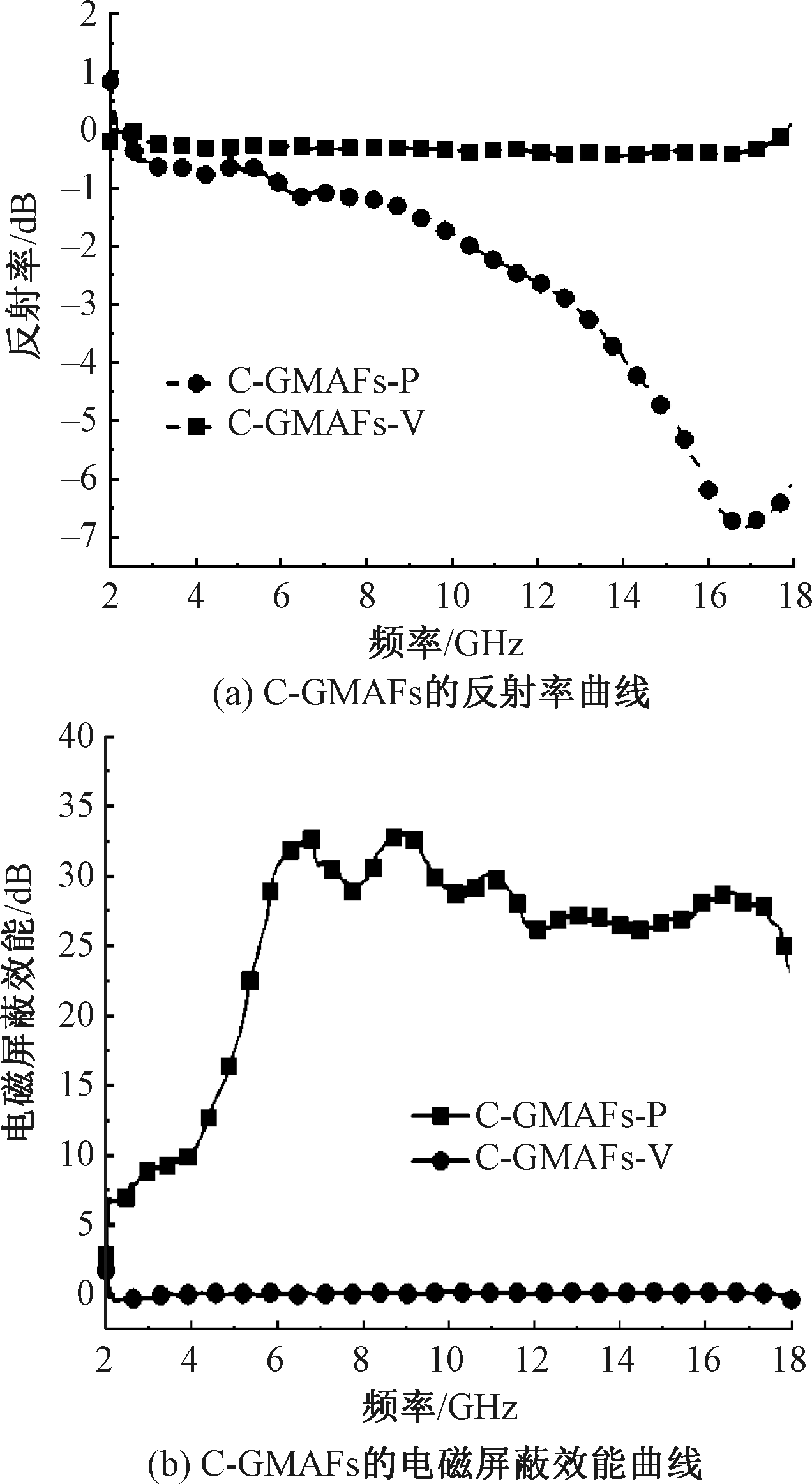 | Fig.7 Test curves of electromagnetic properties for C-GMAFs in different orientations. (a) Reflectivity curves; (b) Electromagnetic shielding curves |